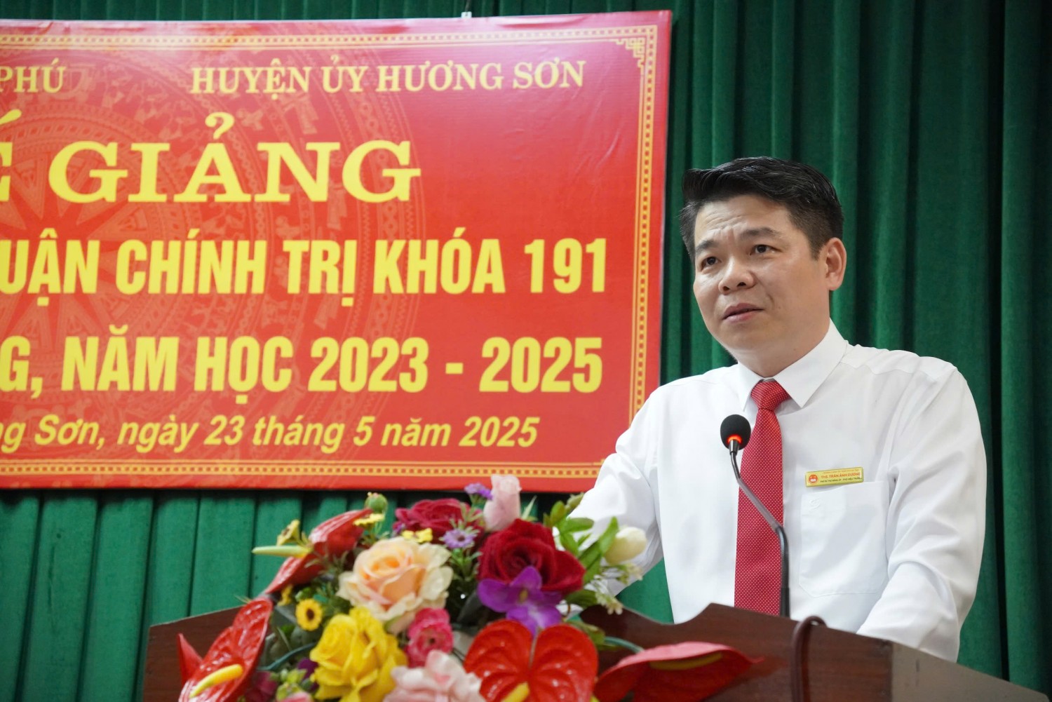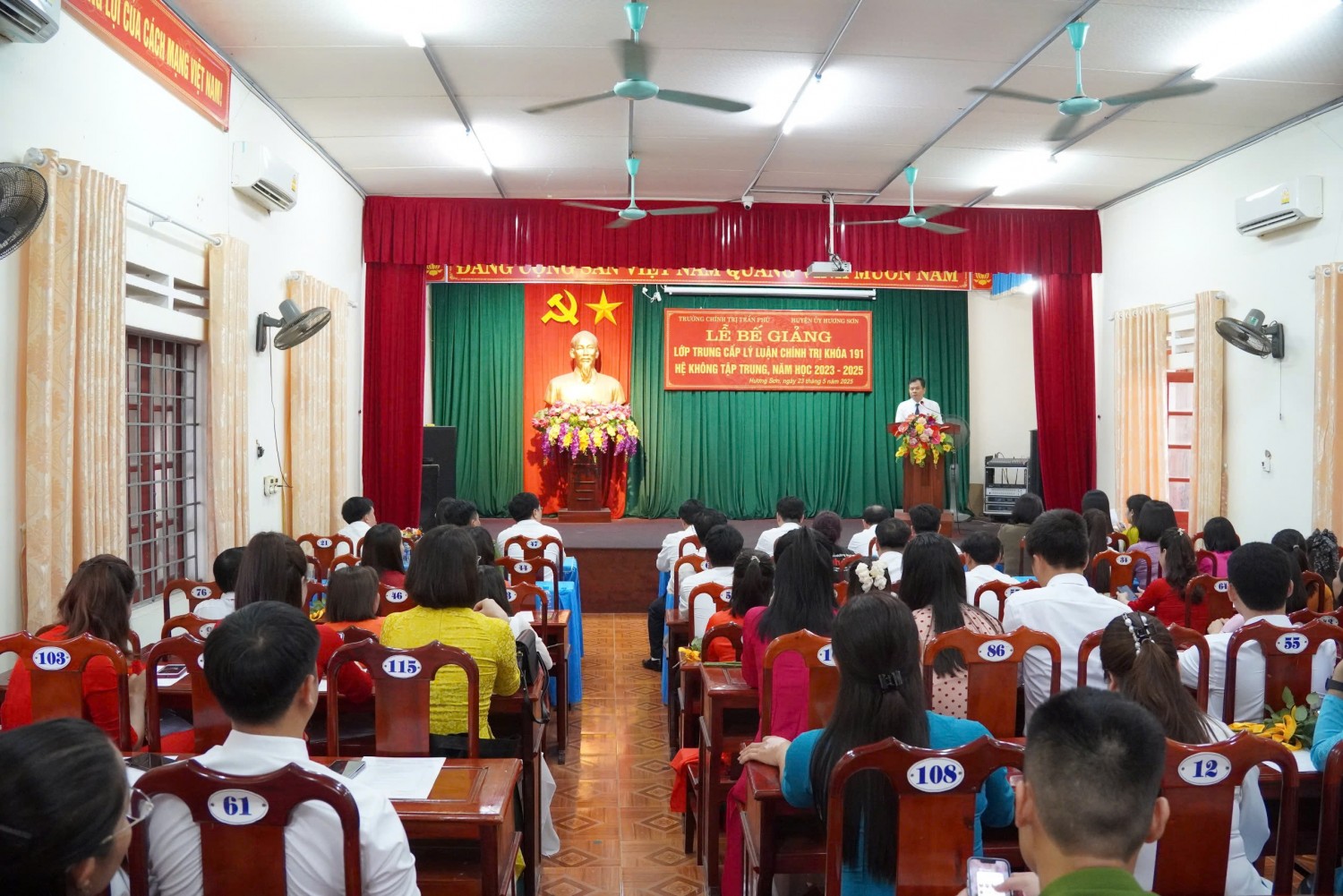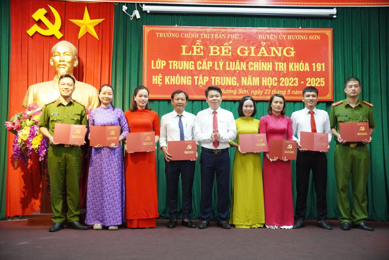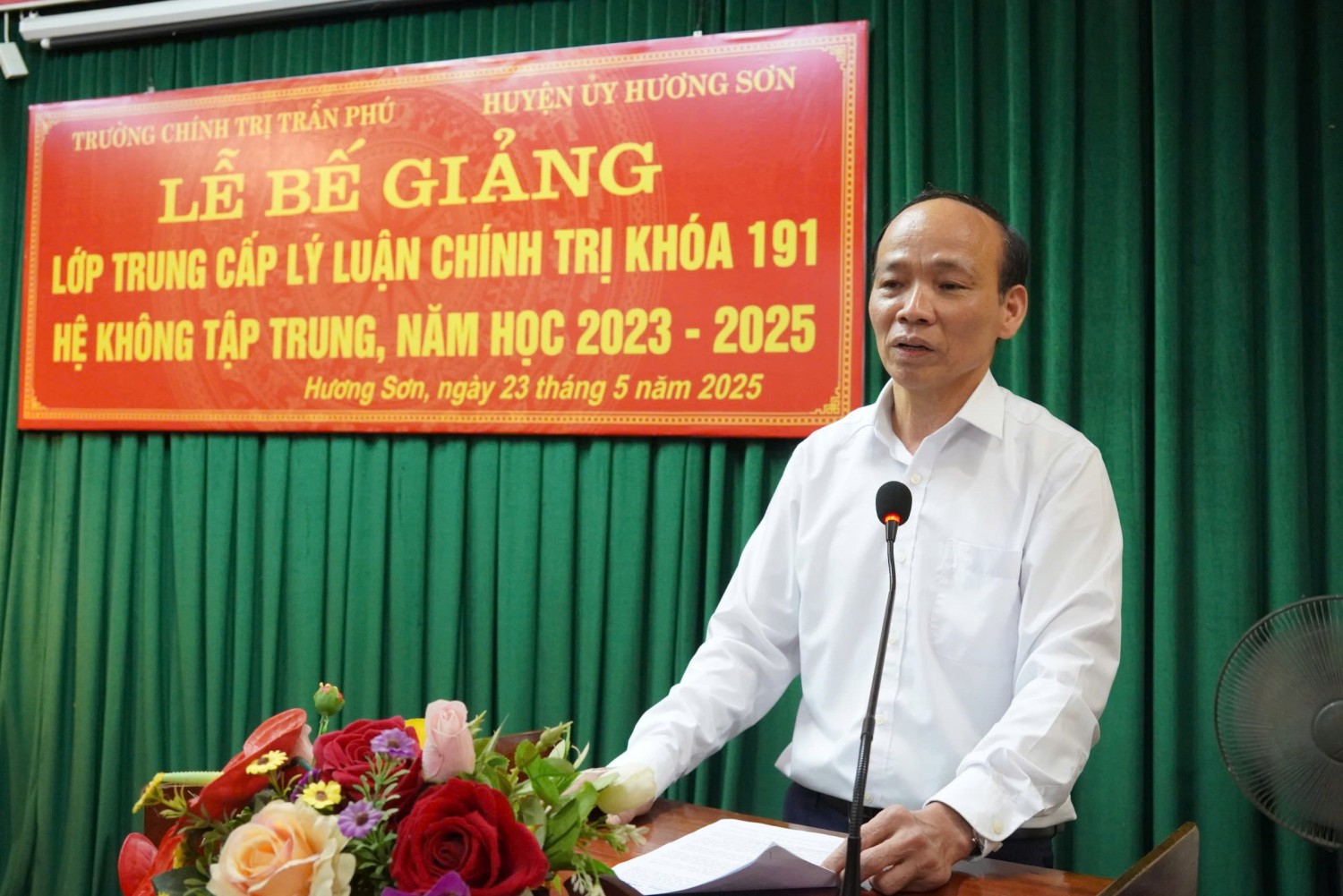 Chiều ngày 23/5, Trường Chính trị Trần Phú phối hợp với Huyện uỷ Hương Sơn tổ chức bế giảng lớp Trung cấp Lý luận Chính trị, hệ không tập trung khóa 191. Dự lễ bế giảng có đồng chí Trần Ánh Dương, Phó Hiệu trưởng Trường Chính trị Trần Phú; đồng chí Nguyễn Viết Dũng, Phó Bí thư Thường trực Huyện ủy; đại diện lãnh đạo các khoa, phòng Trường Chính trị Trần Phú và đại diện các Ban xây dựng Đảng Huyện ủy Hương Sơn