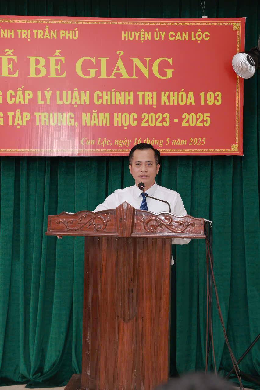 Phát biểu tại lễ bế giảng, T.S Nguyễn Quang Ngọc, Phó Hiệu trưởng Trường Chính trị Trần Phú và đồng chí Bùi Văn Sơn, Phó Bí thư Thường trực Huyện ủy, Chủ tịch HĐND huyện, chúc mừng kết quả học tập của các học viên, đồng thời khẳng định, có được kết quả trên là do sự quan tâm chỉ đạo thường xuyên của Ban Giám hiệu nhà trường, Huyện ủy Can Lộc cùng sự nhiệt tình, trách nhiệm của các giảng viên, tinh thần học tập nghiêm túc và sự nỗ lực của học viên; đồng thời đề nghị, mỗi học viên cần phát huy những kiến thức đã được học tập, nghiên cứu, vận dụng sáng tạo lý luận vào thực tiễn công tác; gương mẫu thực hiện tốt các nhiệm vụ được giao.