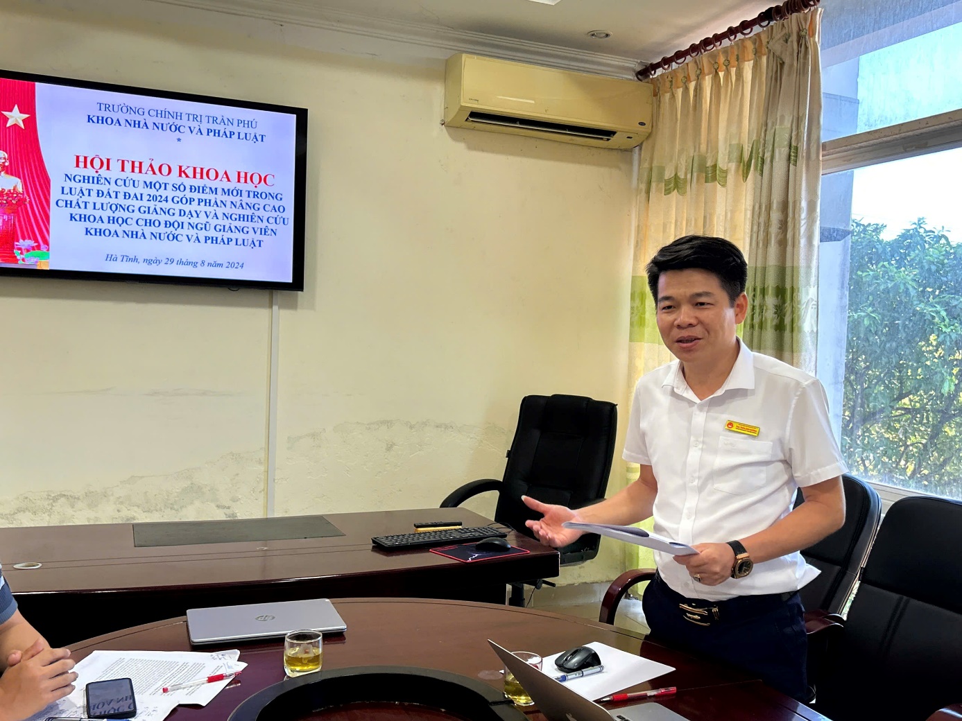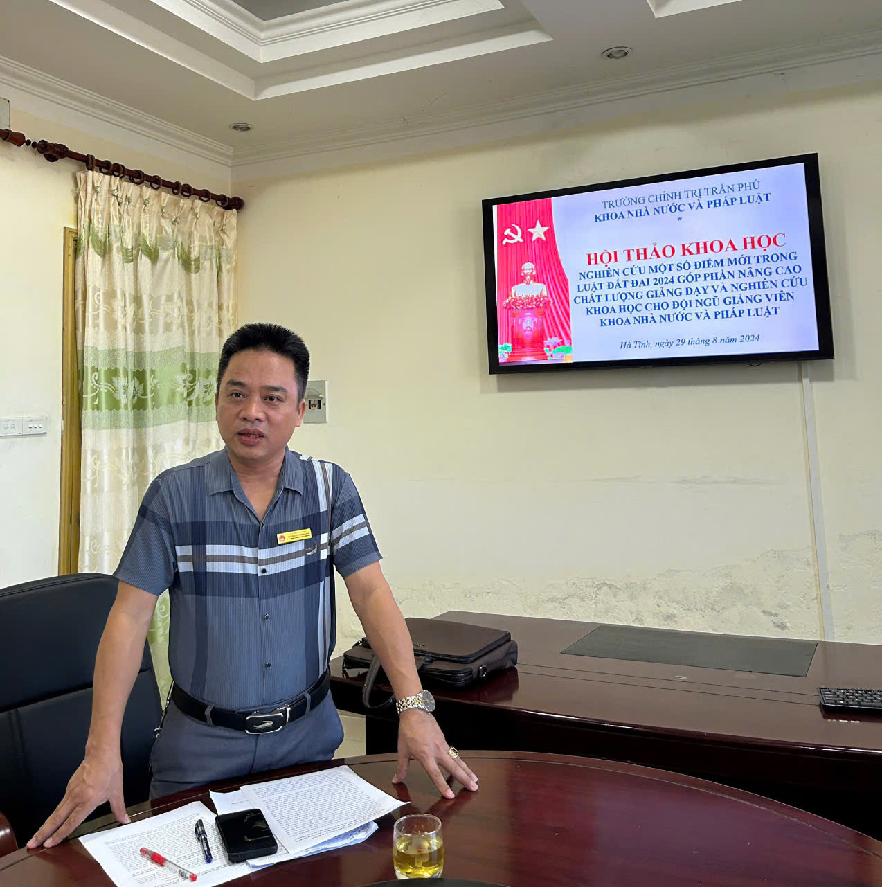 Thực hiện kế hoạch nghiên cứu khoa học năm 2024, sáng ngày 29/8/2024 Khoa Nhà nước và pháp luật tổ chức Hội thảo khoa học chủ đề “Nghiên cứu một số điểm mới trong Luật Đất đai 2024 góp phần nâng cao chất lượng giảng dạy và nghiên cứu khoa học cho đội ngũ giảng viên Khoa Nhà nước và pháp luật”. Tham dự Hội thảo có ThS. Trần Ánh Dương, Phó Bí thư Đảng ủy, Phó Hiệu trưởng cùng toàn thể cán bộ, giảng viên, giảng viên kiêm chức Khoa Nhà nước và pháp luật.