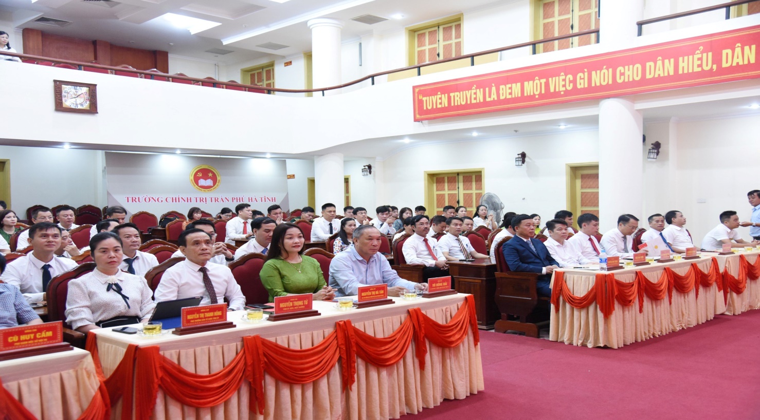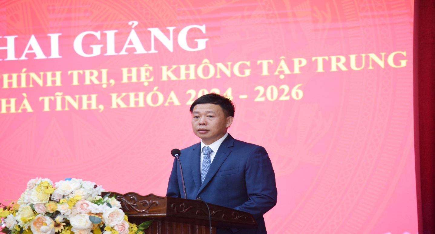 Sáng ngày 02/8/2024, Học viện Chính trị khu vực I phối hợp với Tỉnh ủy Hà Tĩnh tổ chức Lễ Khai giảng lớp Cao cấp lý luận chính trị hệ không tập trung K71.B01, tỉnh Hà Tĩnh, khóa học 2024 - 2026. Dự Lễ Khai giảng có PGS.TS Nguyễn Vĩnh Thanh - Giám đốc, các đồng chí lãnh đạo Ban Quản lý đào tạo, Học viện Chính trị Khu vực I; TS. Võ Hồng Hải - Ủy viên Ban Thường vụ, Trưởng Ban Tổ chức Tỉnh ủy, các đồng chí đại diện lãnh đạo Ban Tổ chức Tỉnh ủy, Ban Tuyên giáo Tỉnh ủy, Sở Nội vụ Hà Tĩnh; TS. Nguyễn Trọng Tứ - TUV, Bí thư Đảng ủy, Hiệu trưởng, các đồng chí trong Ban Giám hiệu và lãnh đạo các khoa, phòng Trường Chính trị Trần Phú.