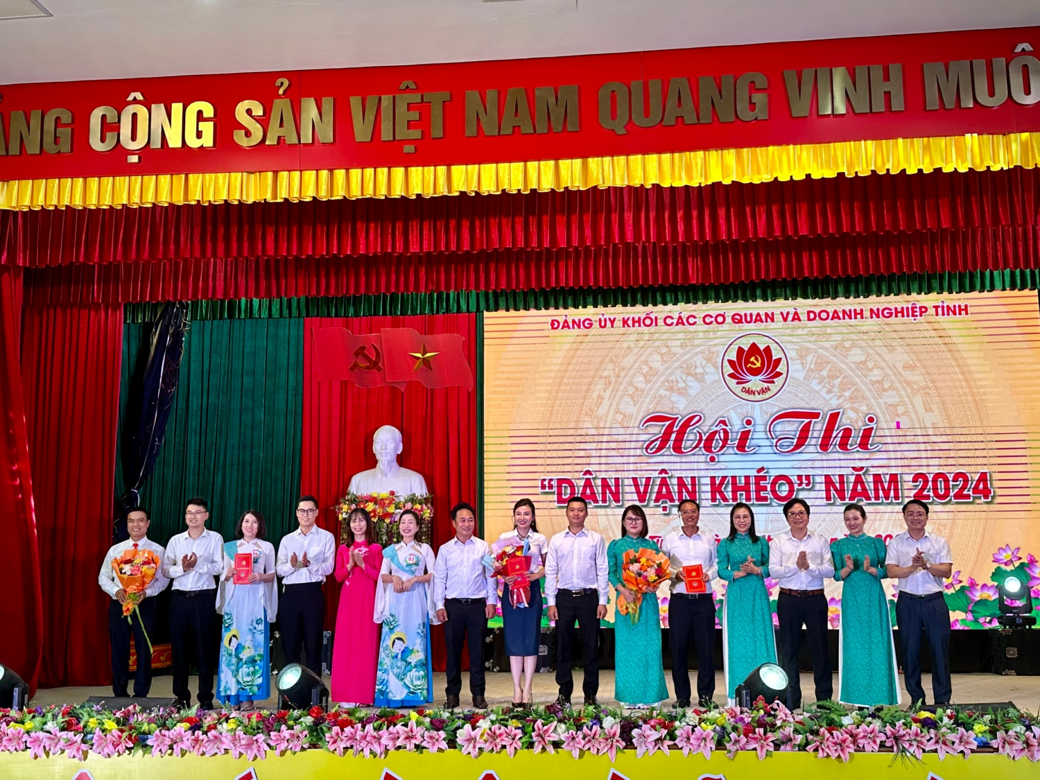 Đồng chí Hoàng Trung Dũng - Bí thư Tỉnh ủy, đồng chí Trương Thanh Huyền - Trưởng Ban Dân vận Tỉnh ủy và các đồng chí Thường trực Đảng ủy Khối tặng cờ lưu niệm cho các đội thi